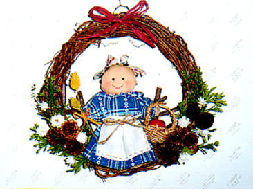 お使いの帰り道、野草を摘んでいるジンジャードール。秋冬の田舎の風景をリースに表現。